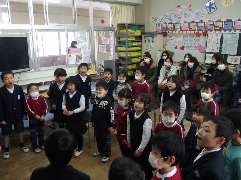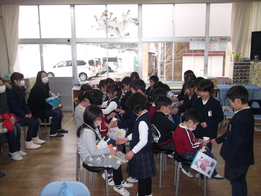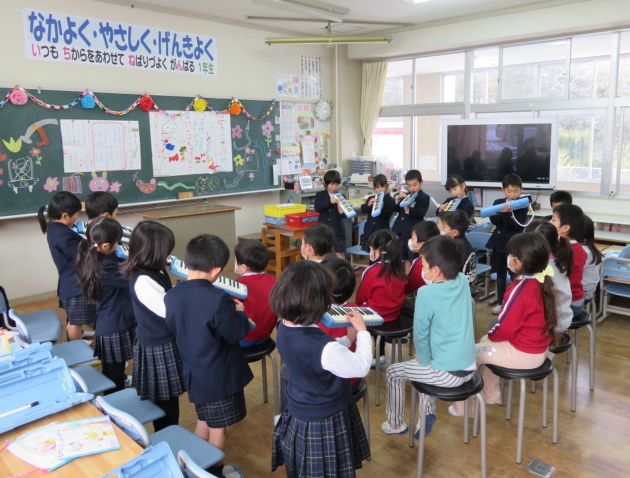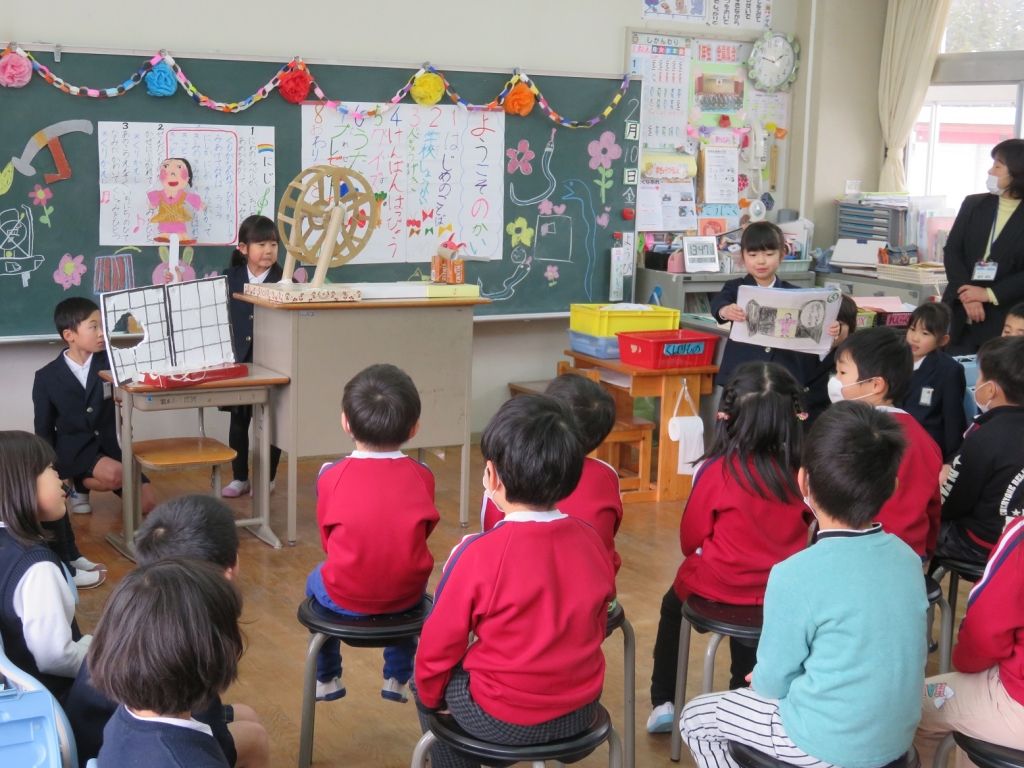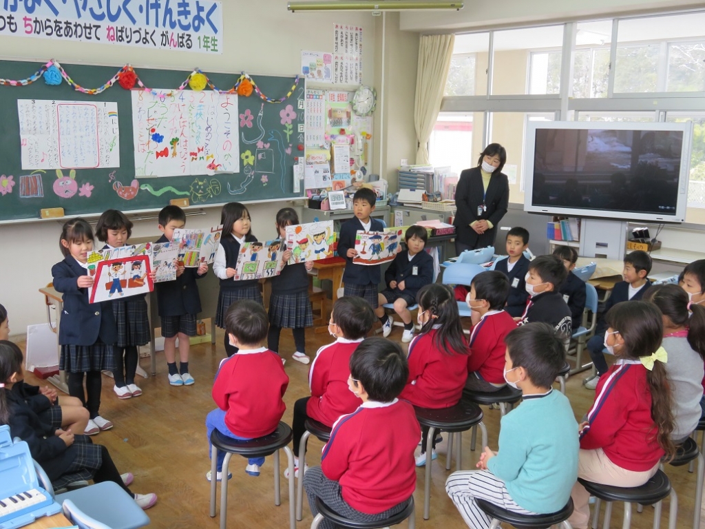 1年生は司会進行を自分たちで行い、学校紹介、紙芝居、クイズ、合奏や、新入生との歌、プレゼント渡しなどのたくさんのプログラムを進め、どの内容も、1年生自身の1年間の成長がよく分かる、とても元気ではつらつとした会でした。