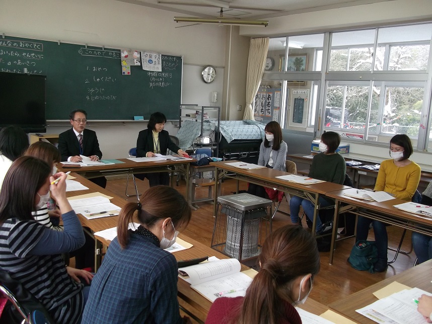 来年度入学する13名の児童(1名欠席)と保護者の皆様においでいただき、1年教室での入学体験、さらに5年生との交流、保護者の方への説明をしました。