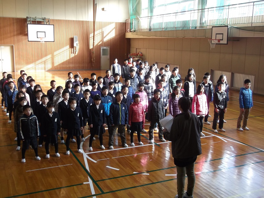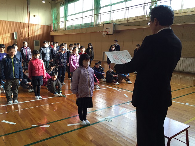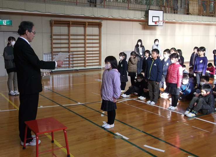 今朝の児童朝礼では、書き初め展の入賞者への賞状伝達と、卒業式歌の全体練習第1回目を行いました。卒業式の歌の練習では、どの児童も立派な卒業式にしようと、教室での練習成果を発揮し、大きな声で気持を込めて歌うことができていました。「第165回岡山県小中学校書きぞぞめ展」入賞者○金賞 1年 吉國菜々心○銀賞 1年 植田 倖○銅賞 1年 柴倉菜月 1年 立花維晋 4年 林 玄莉 5年 石垣直正 5年 石垣理子 6年 藤井美緒