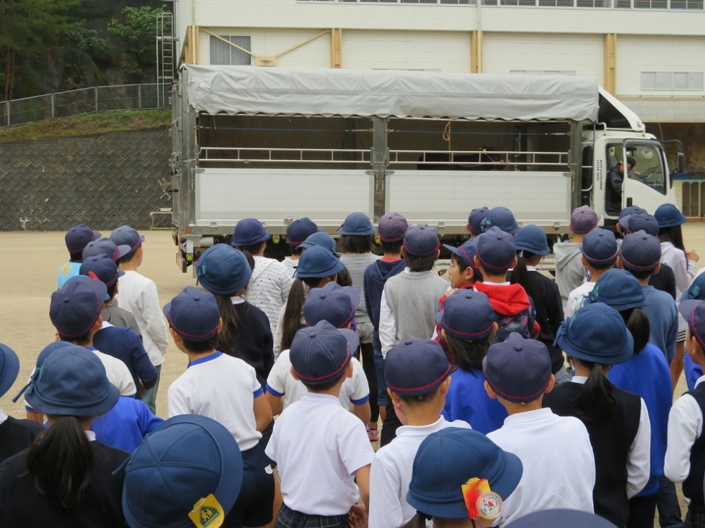 児童は、大きなトラックで仔牛が運ばれてくると歓声をあげ、それでも仔牛を驚かさないように小さな音の拍手で迎えました。