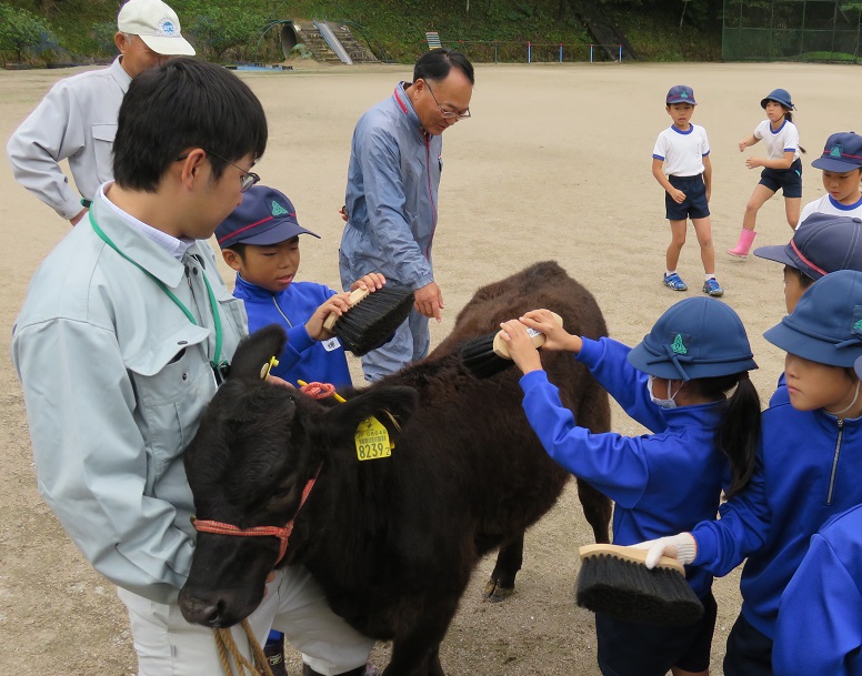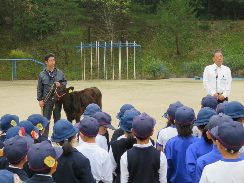 今朝、千屋牛の仔牛(生後4ヶ月)が学校にやってきました。