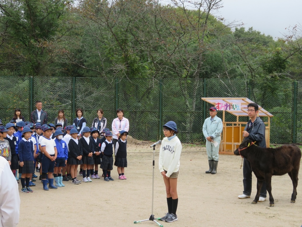 歓迎式では、校長が、地元には古くから牛市があり、地域でも多くの農家で牛を飼っていたこと。また、仔牛の飼育を通して命の大切さを感じてほしいことを話しました。続いて、お世話になっている新見市役所の農林課長様からのごあいさつをいただき、最後に児童代表が歓迎の言葉を述べました。そして全員で、お世話になる市役所の方、備中県民局の方、哲多牧場の方、ボランティアの方々に「よろしくお願いします。」とあいさつをして、歓迎式を終わりました。