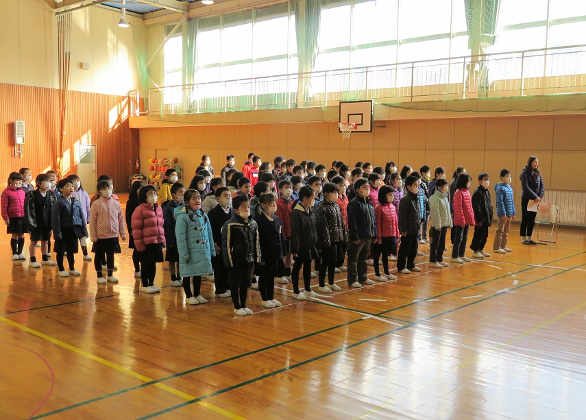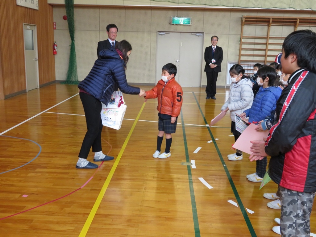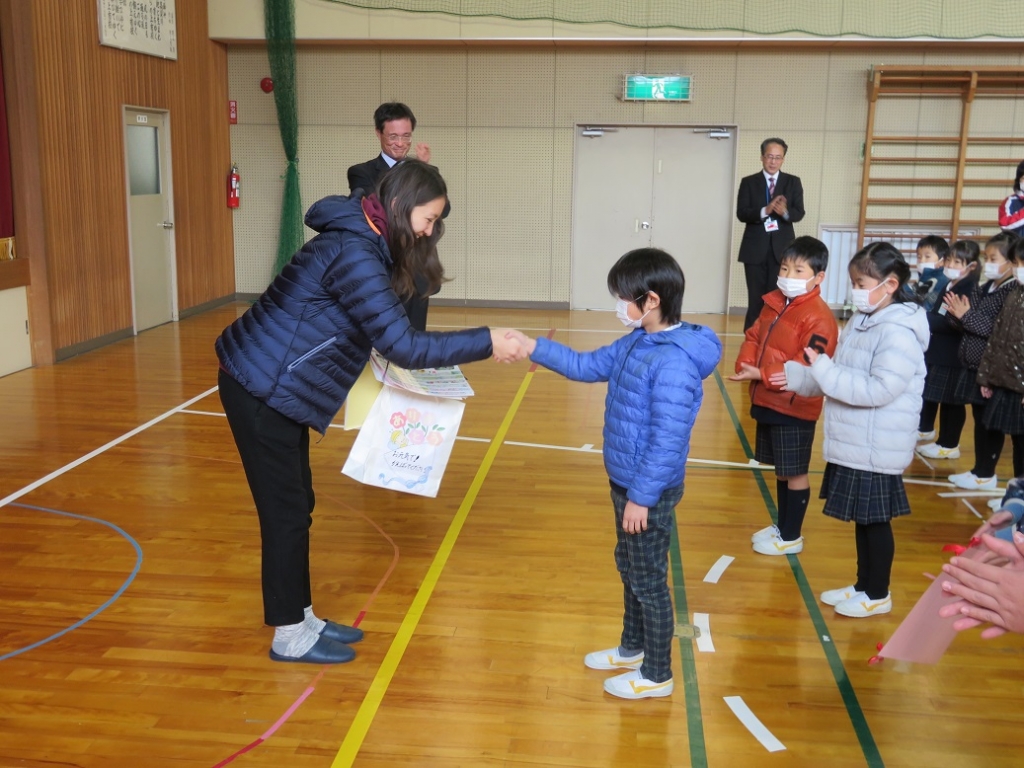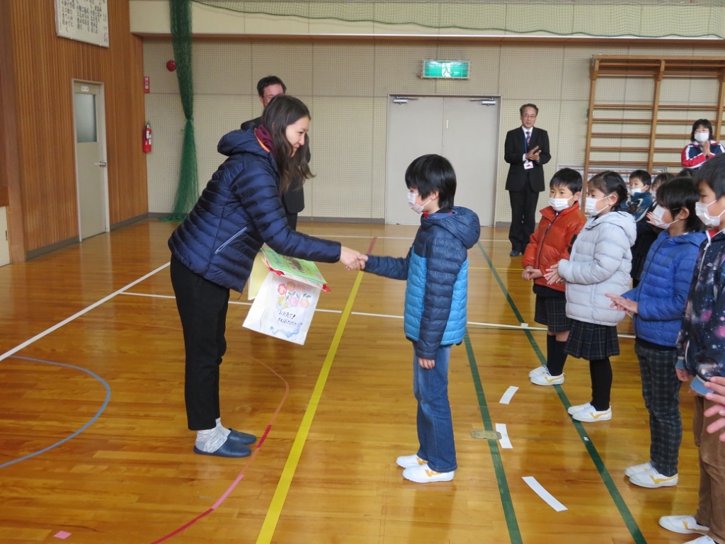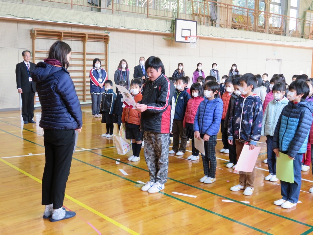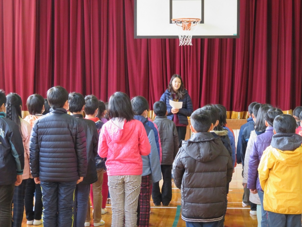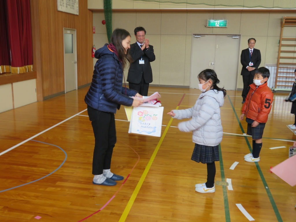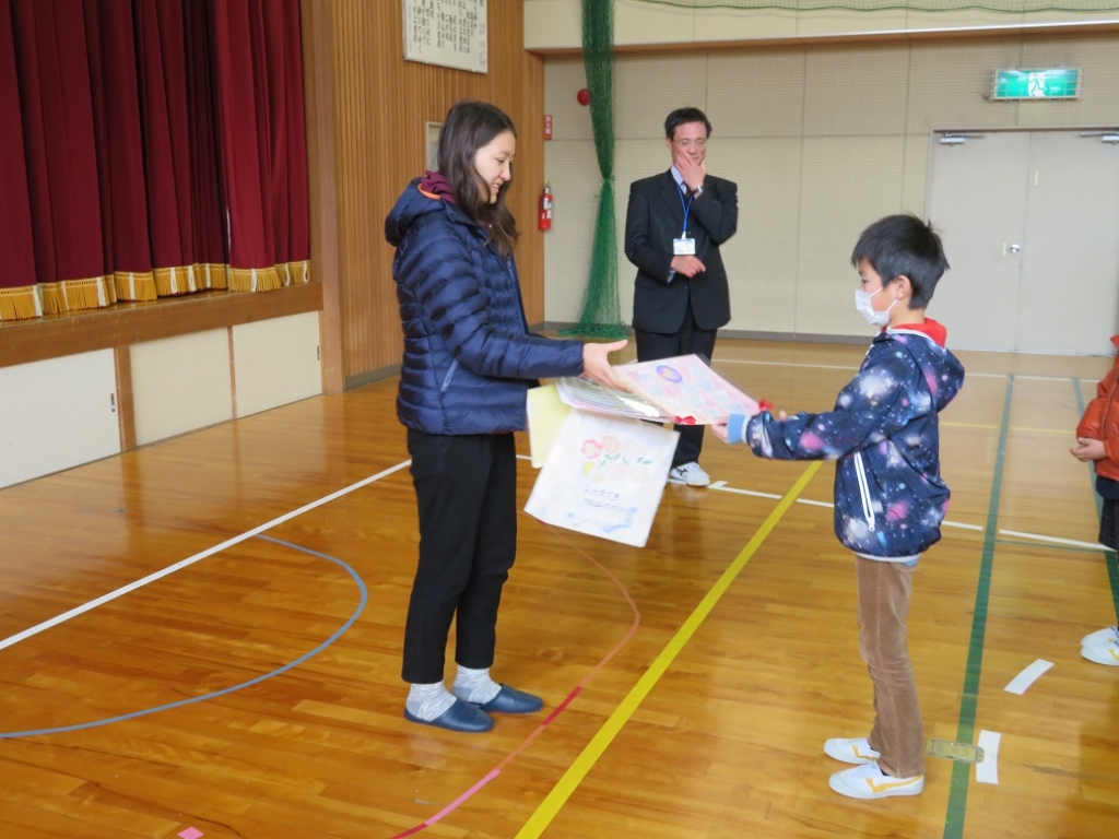 式では、校長の紹介の後、児童代表の6年生がお礼とお別れの言葉を述べ、各学年代表が記念品(お礼の手紙や寄せ書き等)をエミ先生お贈りしました。