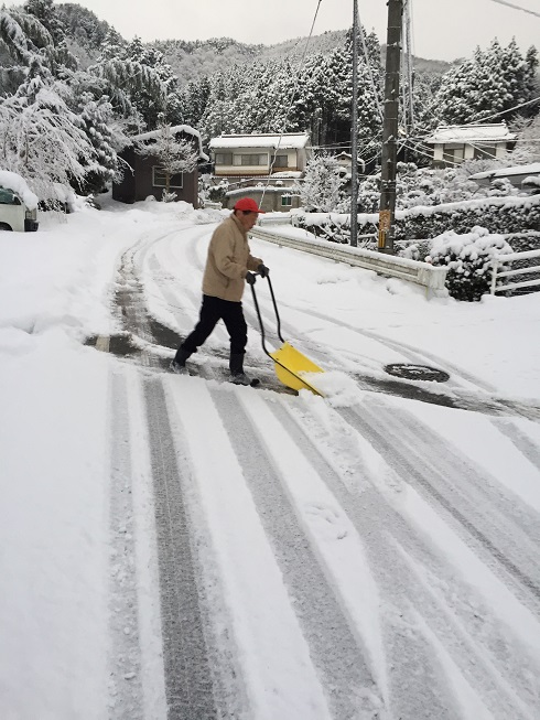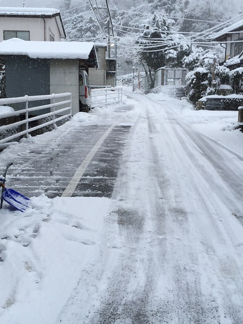 先週から、毎朝学校坂と坂下の旧道は真っ白です。