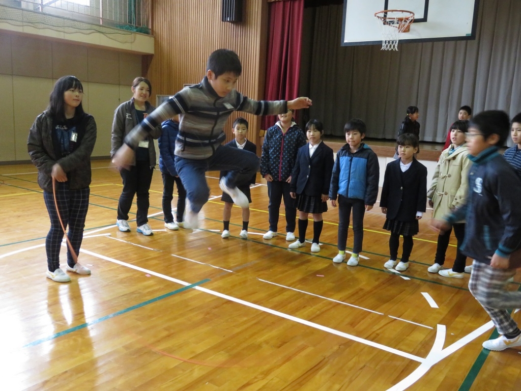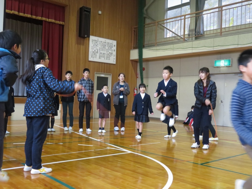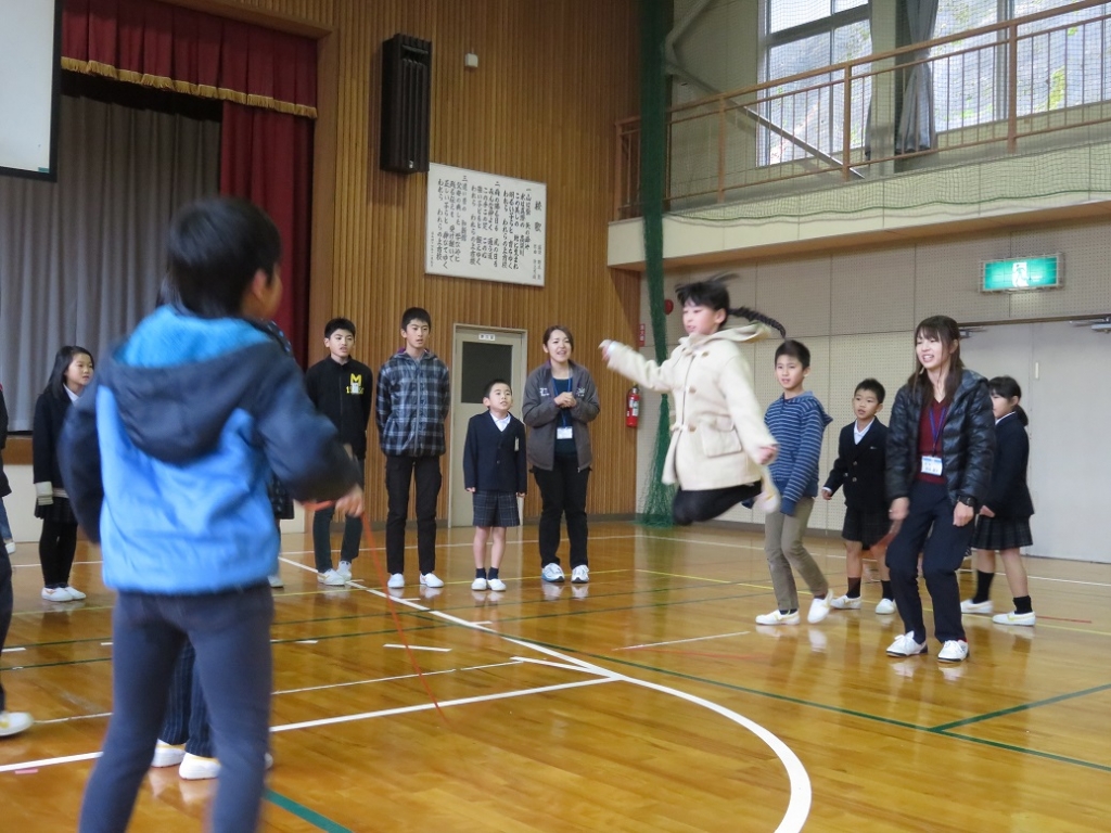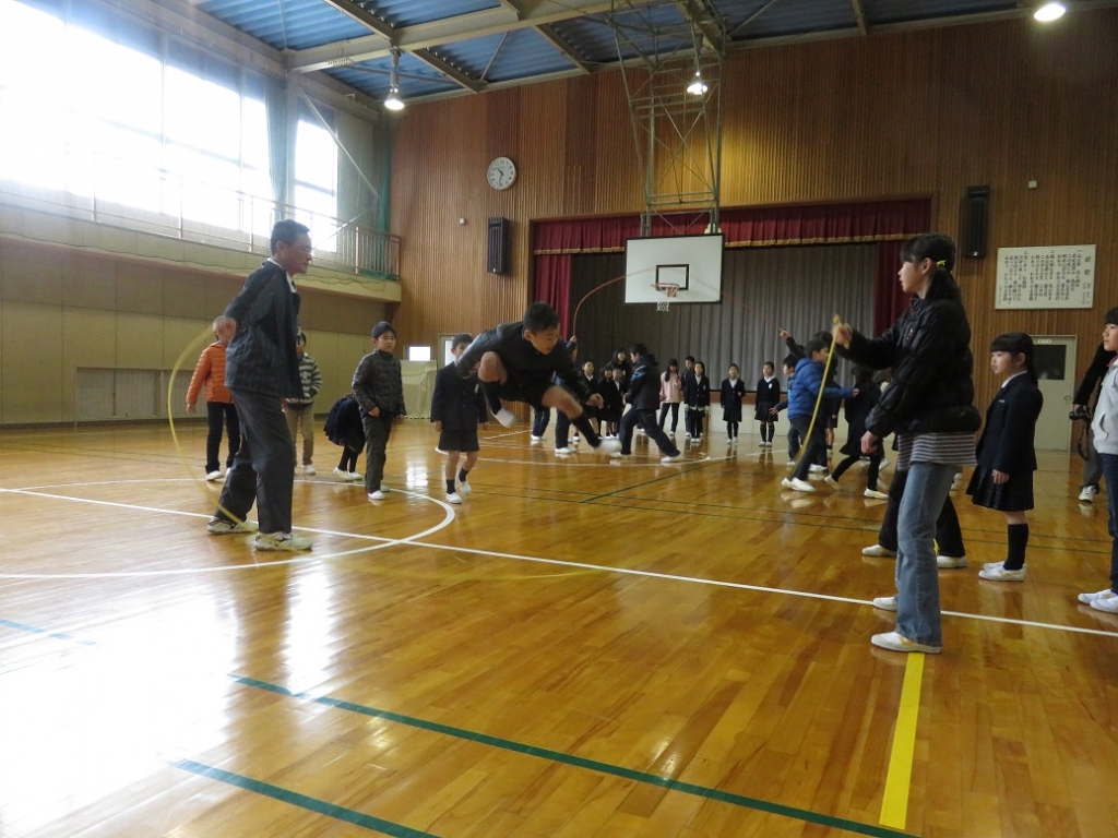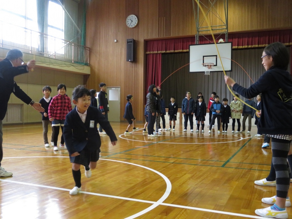 規定の時間内で、一人ずつ次々と跳んでいき、連続で跳べた回数を競いましたが、全員が本気で挑み、大きな声で声援もし、また、各班担当の先生方も熱く叱咤激励しながら長縄を回していました。なお、最高は85回でした。