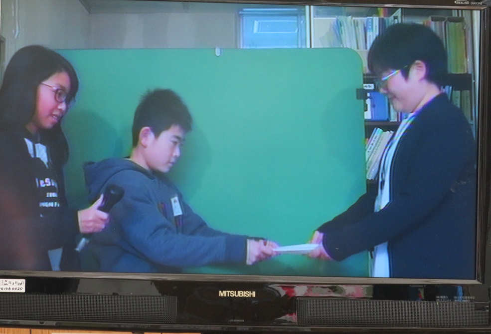 給食時間に、先日児童が書いた給食調理員さん方への感謝の手紙を、代表児童が江川栄養士さんにお渡しし、その様子をテレビ放送しました。