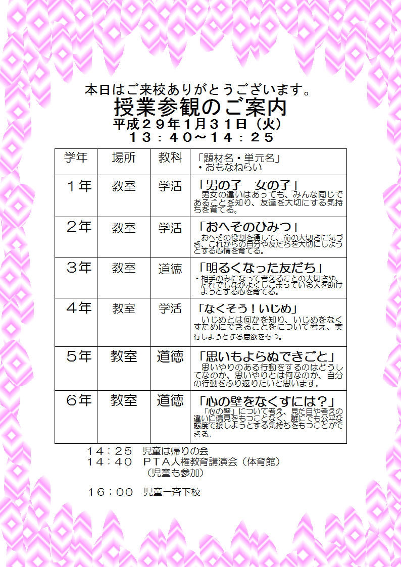 既にご案内いたしましたように、1月31日(火)に授業参観並びに人権教育講演会を開催します。