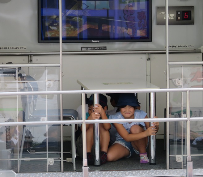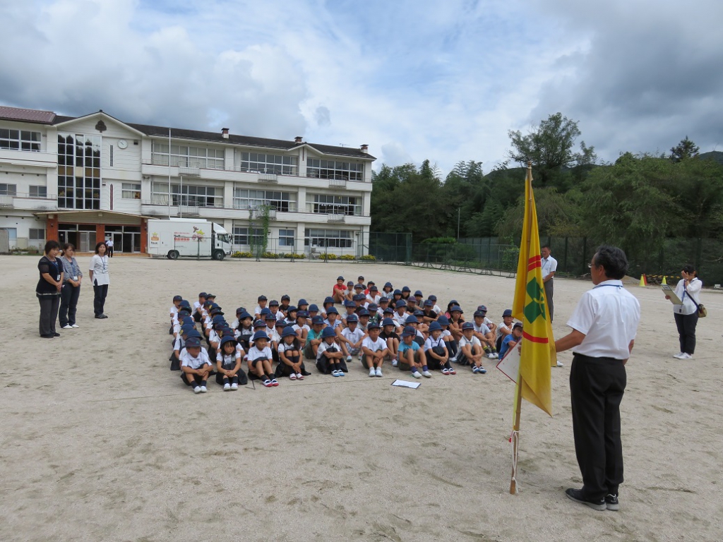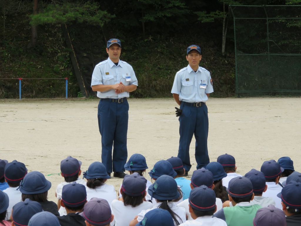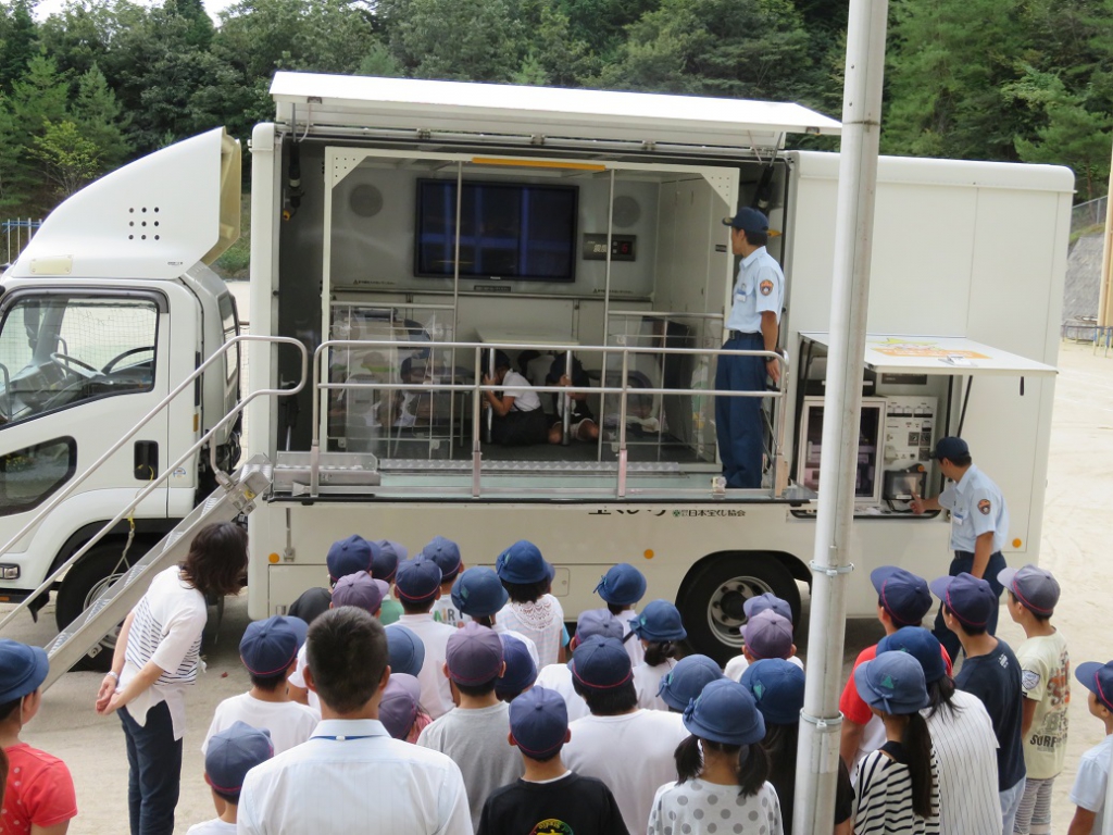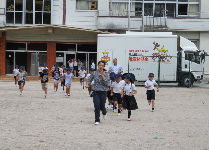 今日は、新見市消防本部予防課から宮原様、名越様がお出でくださり、児童の避難の様子を見ていただき、ご指導をしていただくと共に、起震車による地震体験を実施していただきました。