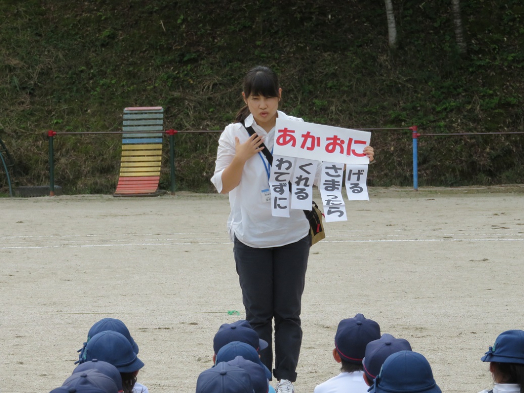 「あ:あわてずに か:かくれる お:おさまったら に:にげる」