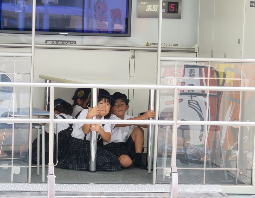 続く地震体験では、近年発生した地震が複合的に起こったという想定で、激しい揺れの中で机の下に隠れることができるかどうかを全学年が交替で体験しました。