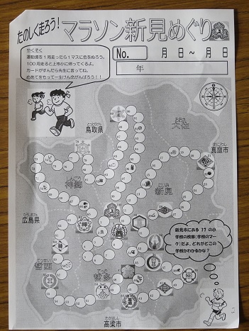 「マラソン新見めぐり」のカードで目標をたて、自分でマラソンができる時間に運動場のトラックを走っています。