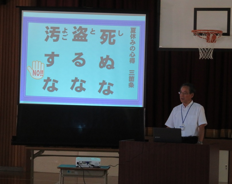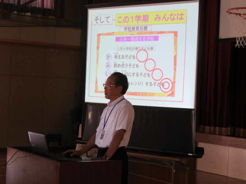 校長の話では、一学期に児童が活躍した様子を写真でふりかえり、「か、み、い、ち」について、よく頑張ったと講評しました。
