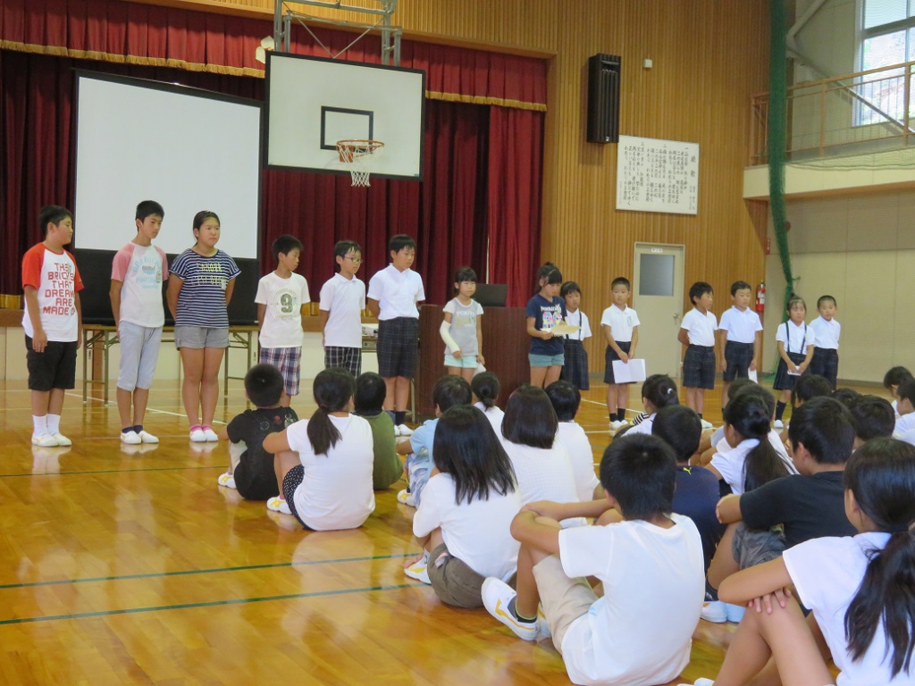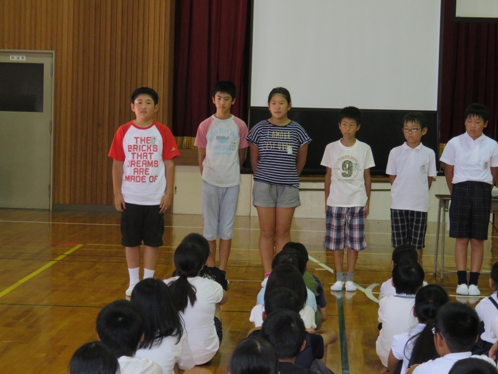 続いて、各学年代表が「一学期にがんばったこと」の発表をしました。代表児童は、習った漢字をすぐ覚えようとしたことや、係や掃除を一生懸命したこと、水泳の記録を伸ばそうとしたことなどを大きな声で発表しました。