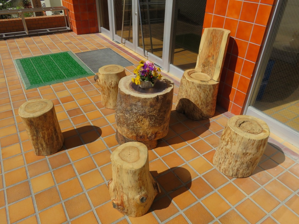 9月の初めに立ち枯れた松の巨木をいただいたので、ガーデンテーブルセットを製作し、このほど玄関前に置きました。