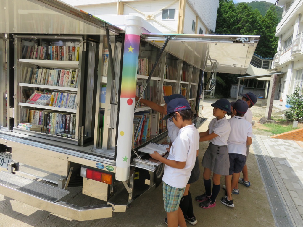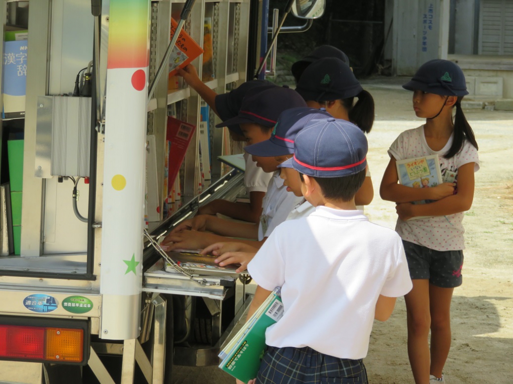 今朝、二学期最初の移動図書、「わかくさ号」がやってきました。