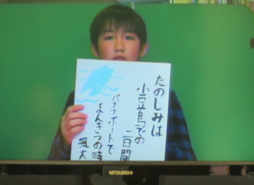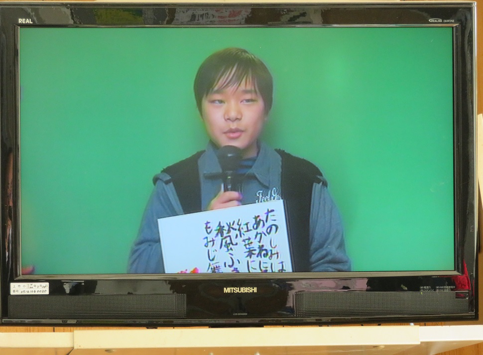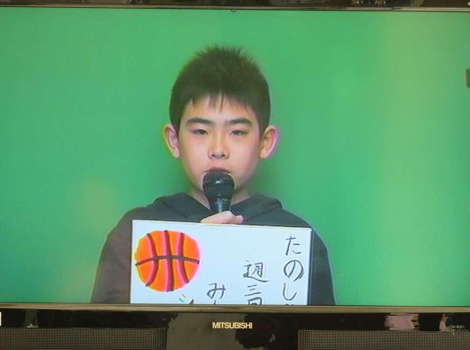この「発表タイム」は、児童に人前で発表したり意見を述べたりする力をつける学習の一つとして行っており、いつもは全校集会等の場面で行っていますが、今回はインフルエンザ等の拡散防止を考慮し、テレビ放送で行いました。