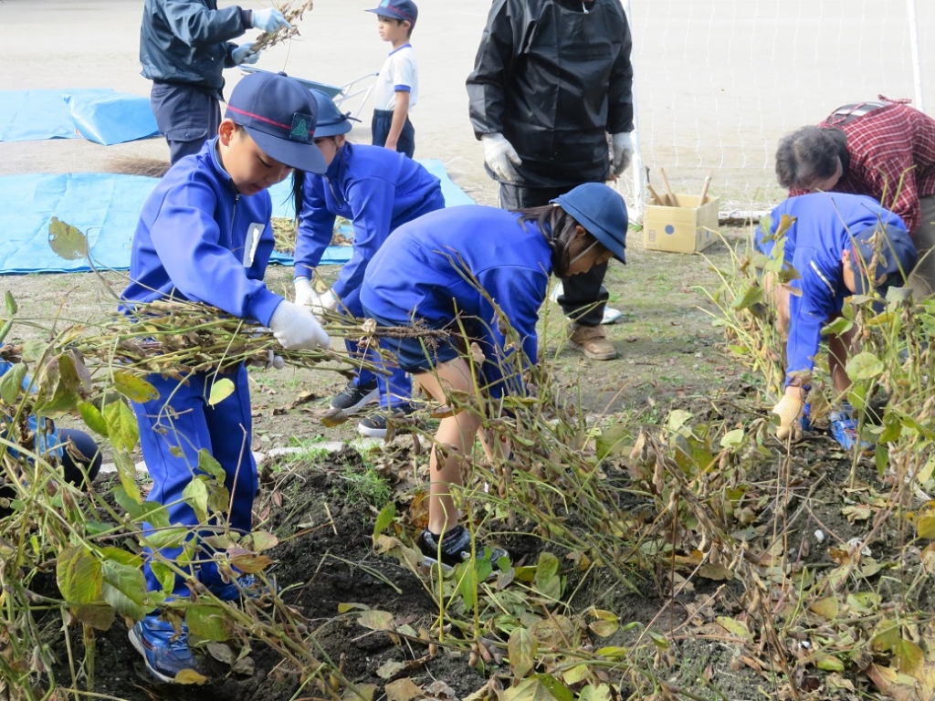 11月18日(金)に、3年生が寿康会の皆様と共に6月からに栽培してきた大豆の収穫を行いました。