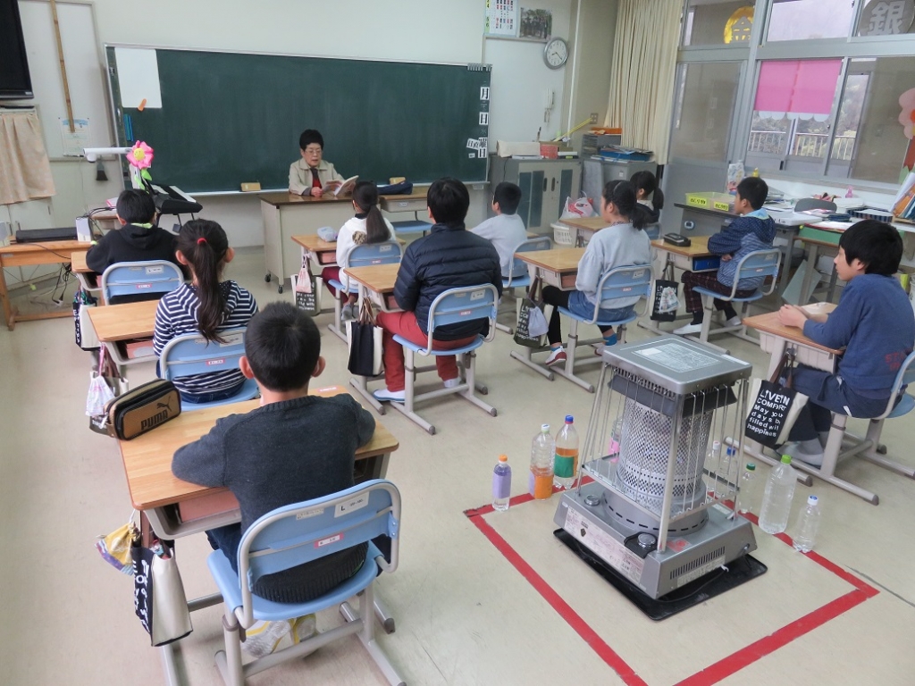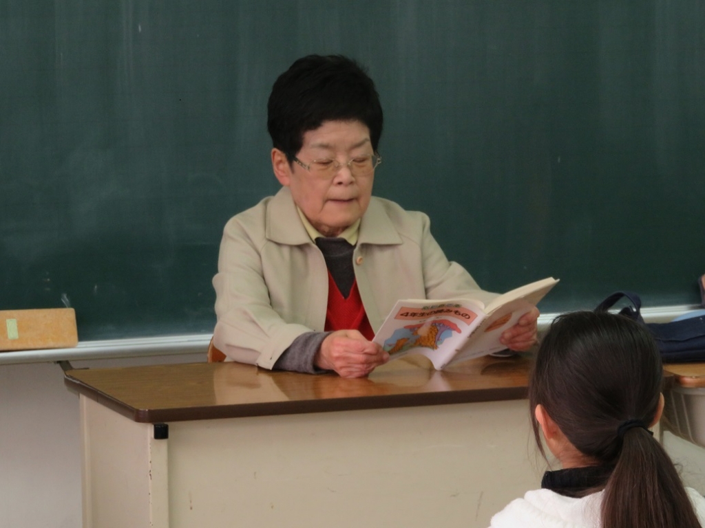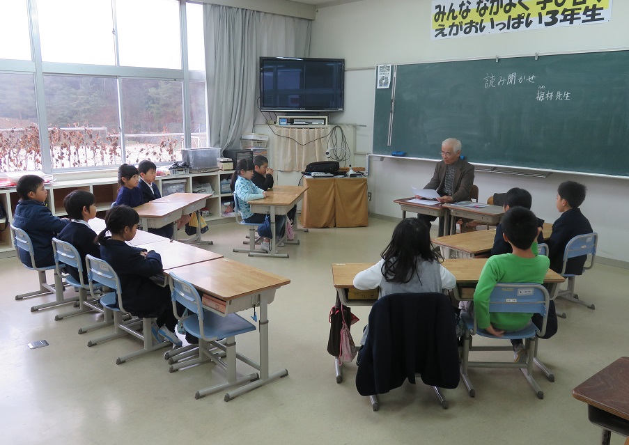3年生は梅林様が、方言を使った地元に伝わる昔話、「親孝行のおせきさん」「きつねにばかされた話」「茶の実」を、巧みな方言で読みきかせてくださいました。3年生は、児童の年代では聞き慣れない方言の意味を理解しようと、いっしょうけんめい考えながら聴いていました。