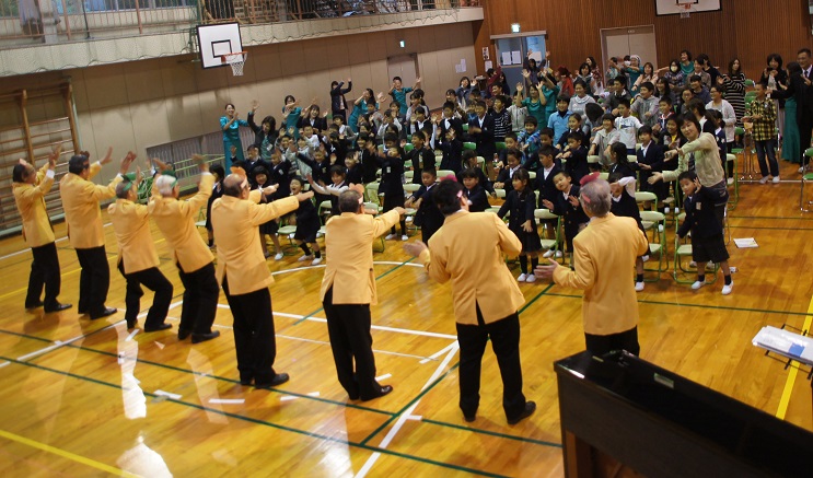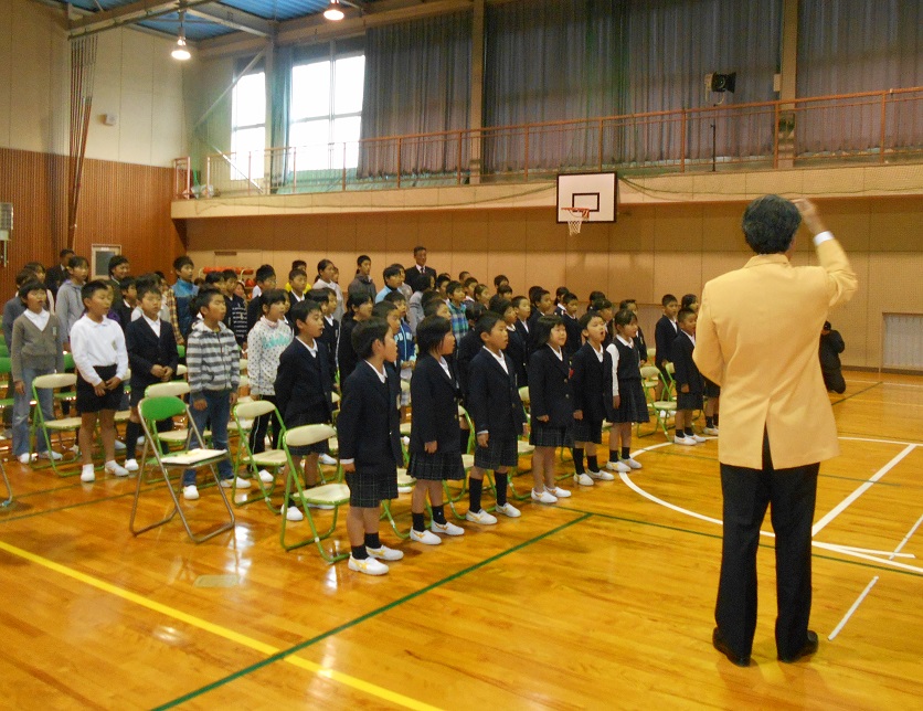 また、プログラムの中では、男声合唱に合わせてカエルの踊り(身振り)をする歌もありましたが、これにも、どの児童もとてもよろこんで楽しく踊りました。このようなところが、上市小児童の良いところです。