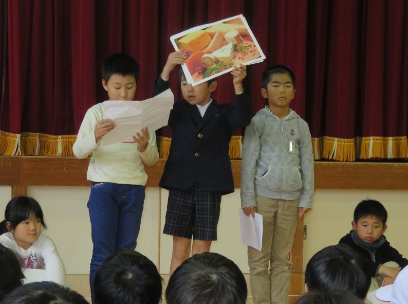 今日は3年生が、国語で学習した「姿を変える食べ物」から、2,3人のペアになって、リンゴや米、牛乳やカツオなどが色々な加工食品になることについて発表しました。