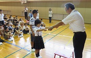 最初に、夏休み中のプール開放日によく泳ぎに来た児童を表彰しました。
