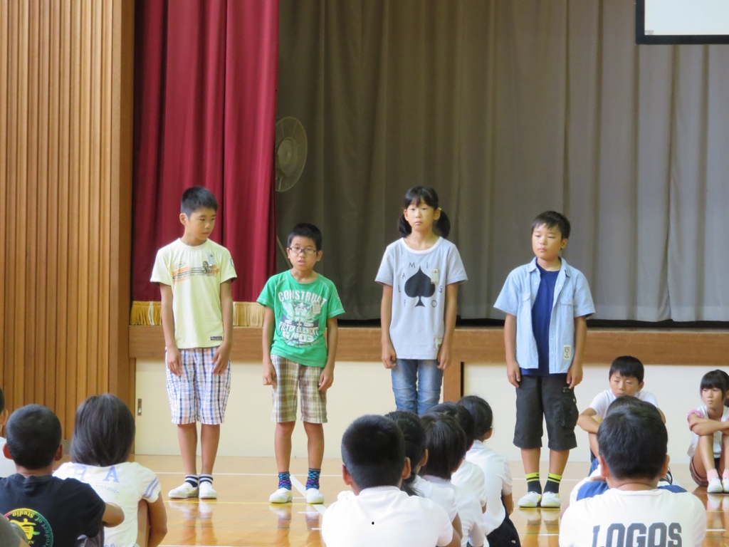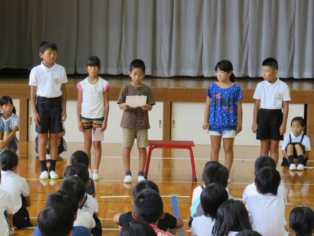続いて、朝礼の中で、各学年の代表者が「二学期にがんばること」の発表をしました。
