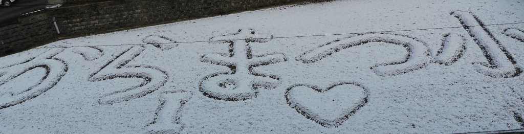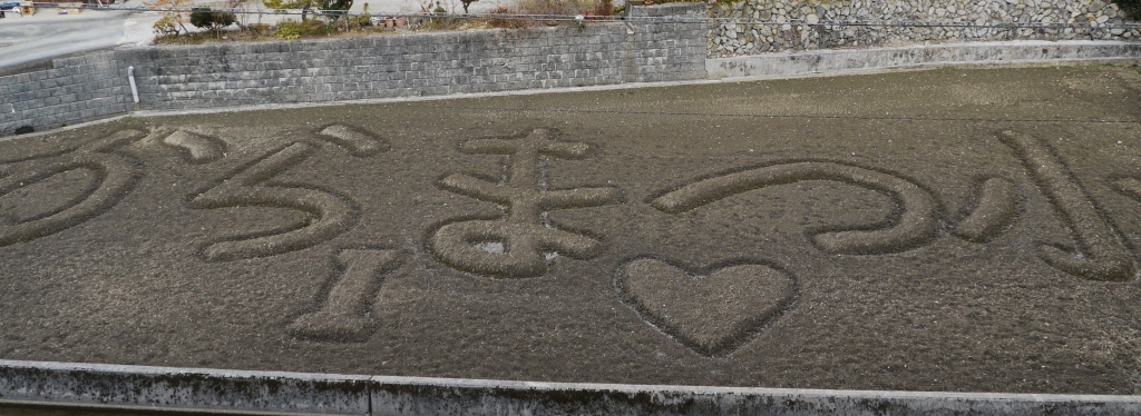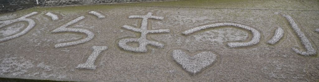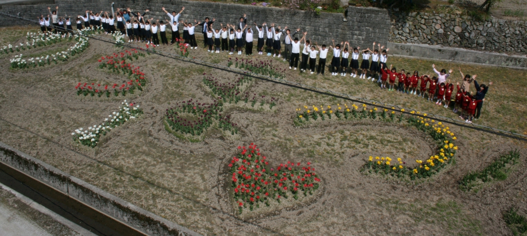 『からまつ小 I love』の文字が全て揃っていませんが、散り始めの花も出始めました。幼稚園の園児も一緒にみんなで記念撮影です。