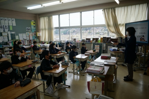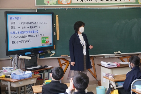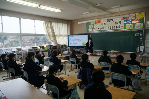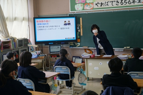 6年生が小学校で生活するのも残り2週間余りとなりました。5・6年児童が、スクールカウンセラーの先生から、中学校の学習・生活について説明をいただきました。児童は真剣耳を傾けて聴いており、小学校との違いや新たに始まる部活動などの活動について理解を深めたようでした。児童は、楽しみなことも多くて期待も大きい反面、いくらか不安も抱いているようでした。6年生は残り1ヶ月で、5年生は1年をかけて中学校に入学する準備をしっかりしていきましょう。