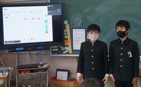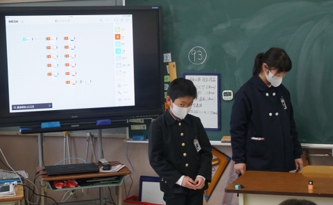 理科の「電気」の単元で、MESHブロック(スイッチとして使えるボタン、光ってお知らせるLED、動きを伝える動き、人の動きを検知人感、明るさの変化を検知明るさ、温度や湿度の変化を検知温度・湿度、検知したアクションを出力GPIO全7種を組み合わせてつくる電気回路作りに挑戦しました。児童は、ブロックのセンサー機能と電気動作(音、光、熱、動き)を組み合わせて、自分たちが作りたい防犯や癒しの回路を試行錯誤を繰り返してプログラミングしました。