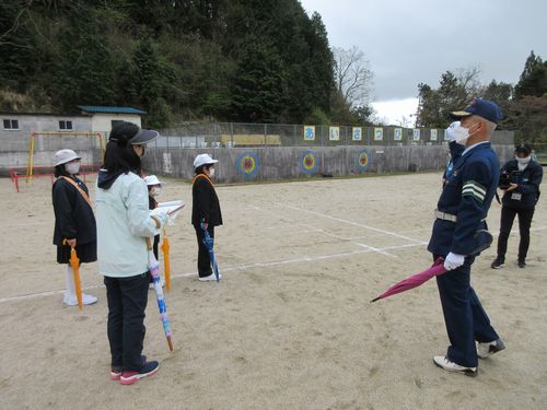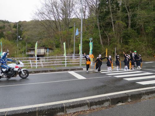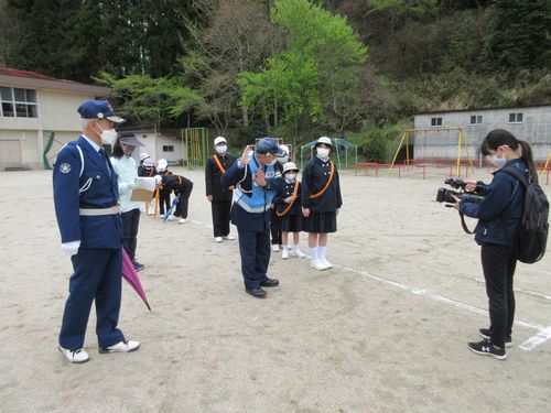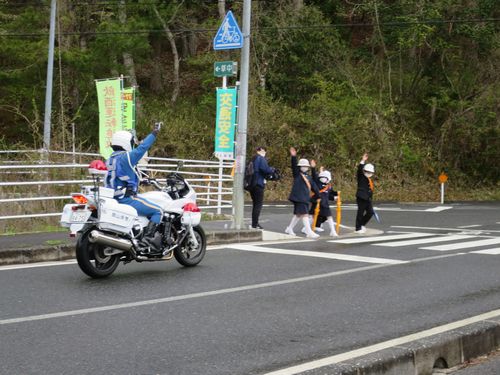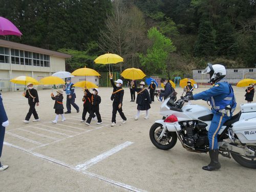 4月14日(水)今年度はじめての交通教室が行われました、子どもたちの命を守る大切な学習です。新見警察署から近藤巡査部長さん、土橋駐在所から加藤巡査部長さん、岡山安全安心教育講師団講師の大月さん、佐藤交通協助員さんが指導に来てくださいました。