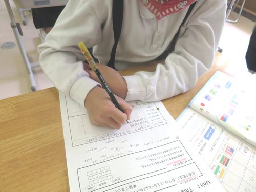 今日の学習の感想などを振り返りシートに記入します。5・6年生は「前より聞き取る英語が増えた。」「今度は話せるようになりたい。」と振り返りの言葉を書いていました。