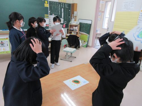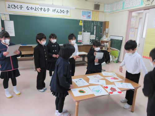 1月17日(火)1・2年生が地域と交流した思い出をかるたにしました。町探検で訪問したお店や見たものを絵に描いた