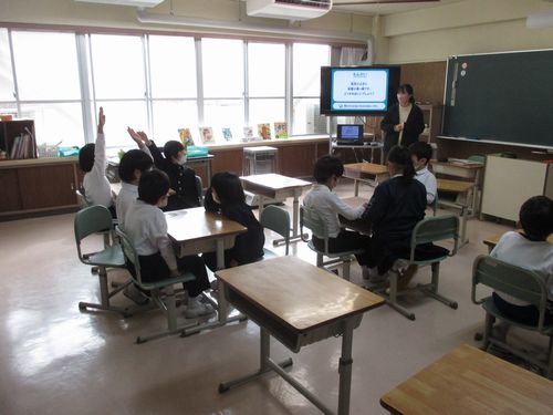 1月16・17日に、安全担当の養護教諭の指導で、災害に備えてどう行動したらよいかを考える防災の授業が行われました。