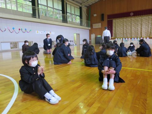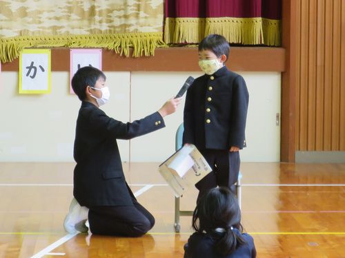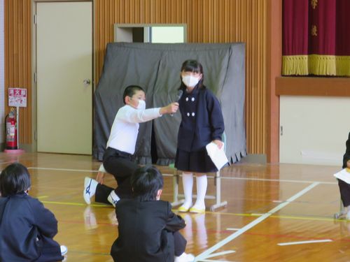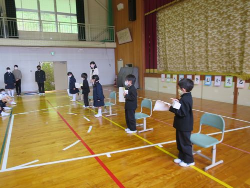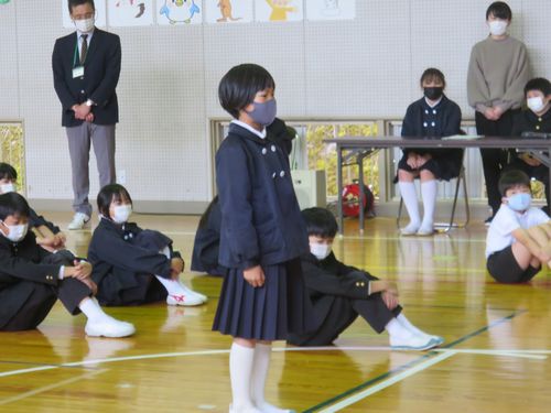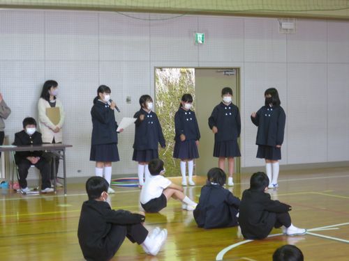 プレゼントももらってお礼を言う1年生です。高学年の人からも『これからも仲良くしましょう』と挨拶がありました。
