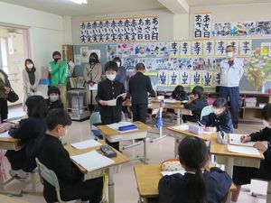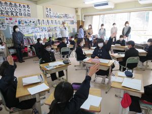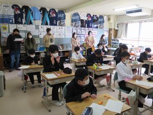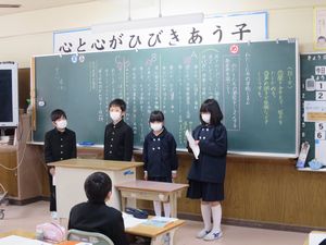 3・4年生は国語科「わたしたちの学校じまん」の学習で、自分達が描いた学校の自慢をグループで発表し、良い所を見つけ合う学習をしていました。