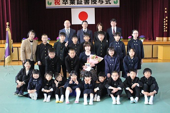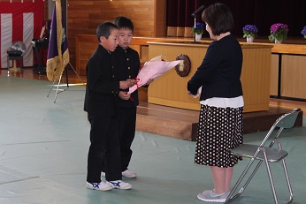続いて、1年間お世話になった山田先生の退任式を行いました。代表の4年生2名がお礼の手紙と花束を渡しました。