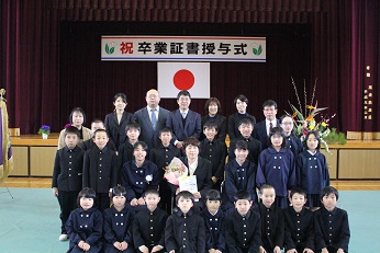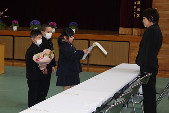 20日の卒業式にお休みした6年生の、卒業証書を授与する式を行いました。他の6年生も来校して一緒にお祝いをしてくれました。在校生からの拍手を受けて堂々と入場したり、点呼されて大きな声で返事をしたりしました。4人の卒業が終了しました。