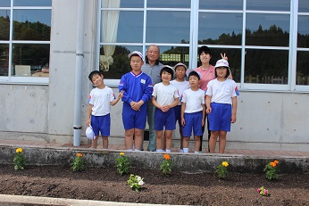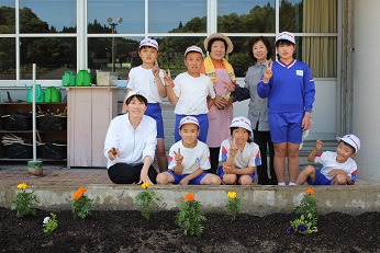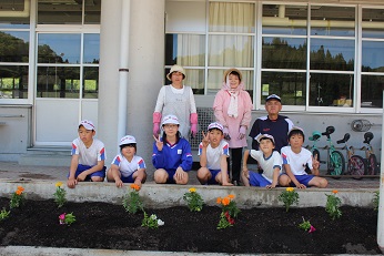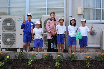 全校で、校舎前の花壇に花の苗を植えました。縦割り班ごとにマリーゴールドとインパチェンスを育てます。ボランティアの方々にも手伝っていただきながら、班長さんを中心に協力して活動しました。これから、水やりなどのお世話をして大切に育てていきます。