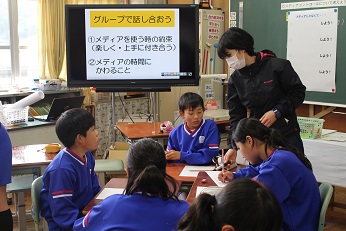5・6年が、「メディアとうまくつきあうにはどうすればよいか」についてみんなで考えました。メディアの長所・短所を話し合った後、メディアにふれる時間を短くするためにはどうすればよいか、メディアを使っている時間に他のことはできないか等について考えました。
