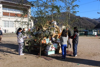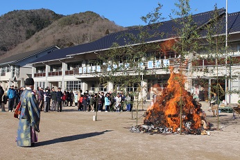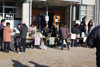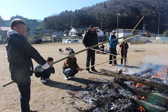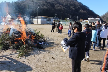 萬歳小学校PTAと萬歳地区ふるさと振興協議会の共催で、萬歳地区とんど祭りを実施しました。神事の後、火入れをし、その火でお餅などを焼きました。参加者は、ぜんざいや甘酒、コーヒーやココアなどを飲食し、交流を深めました。