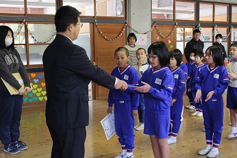2つ目は、ノーメディアデーのお楽しみビンゴの表彰でした。家の方と協力しながら、たくさんの取組みができた人を表彰しました。代表で1年生が校長先生から賞状をもらいました。