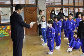 今日の児童朝礼は、6年生2人のスピーチに続き、表彰が2つありました。