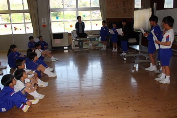 児童朝礼の時、健康委員会が「掃除の仕方」を説明しました。いつもしている掃除ですが、やり方や気をつけることを再確認できました。