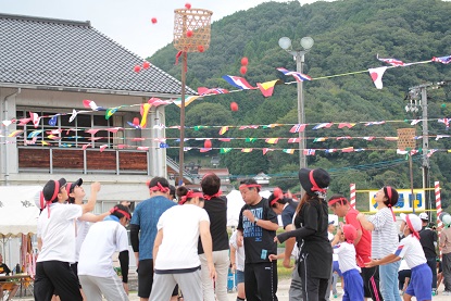 4つの地区で争う競技では、大人も子どもも協力して取り組みました。地区対抗玉入れでは、全部で40個ある玉のうち、37個を入れたチームもありました。
