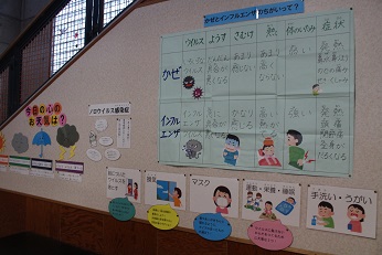 1月の保健の掲示板は、「今日の心のお天気は?]と「かぜとインフルエンザのちがいって?」をテーマに作成しました。 子ども達自身に、自分の今の心と体の状況を考えさせる内容です。掲示物の前では、「自分の今日の心は、曇りじゃな~」「晴れじゃろ~」という会話が聞こえます。また、インフルエンザが流行する時期です。自他の体調管理も大切ですね。