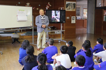 11月中旬から12月上旬まで、学習ボランティアの赤木さんから、カリンの盆栽をお借りしていました。今日の児童朝礼の後、そのカリンの盆栽を見た子ども達からの質問に答えるために赤木さんが来校し、お話をしてくださいました。写真や自作の資料を使って分かりやすく説明してくださいました。ありがとうございました。