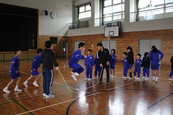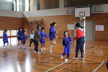 縦割り班の1・2合同班と3・4合同班で長縄とびに挑戦しています。みんなで声を掛け合ってタイミング良く跳んでいます。