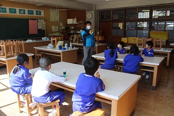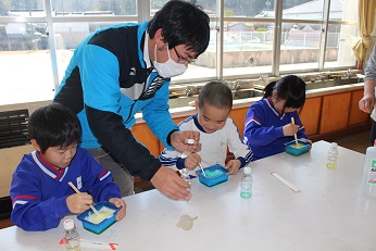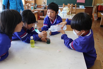 哲多中学校の家本先生(小中連携担当)に、スライムの作り方を教えていただきました。1・2年生は協力しながら、容器に液体のりやハンドソープを入れました。最後に家本先生からほう砂の液を入れてもらって一生懸命混ぜてスライムを作りました。