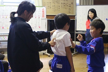 背中伝言ゲームでは、協力してひらがなを1文字を伝えました。