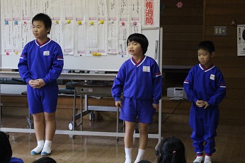 人権標語の発表。高学年は、作った理由も発表しました。